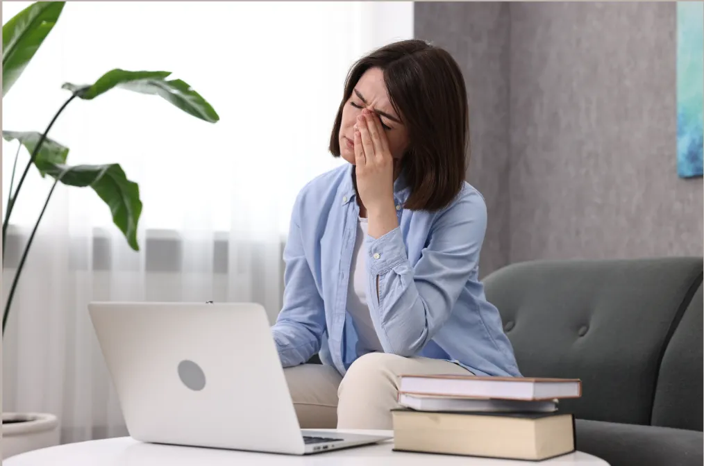 Madre intentando trabajar desde casa mientras cuida a su hijo, reflejando el estrés del equilibrio entre vida laboral y familiar que el programa Oxigénate aborda.